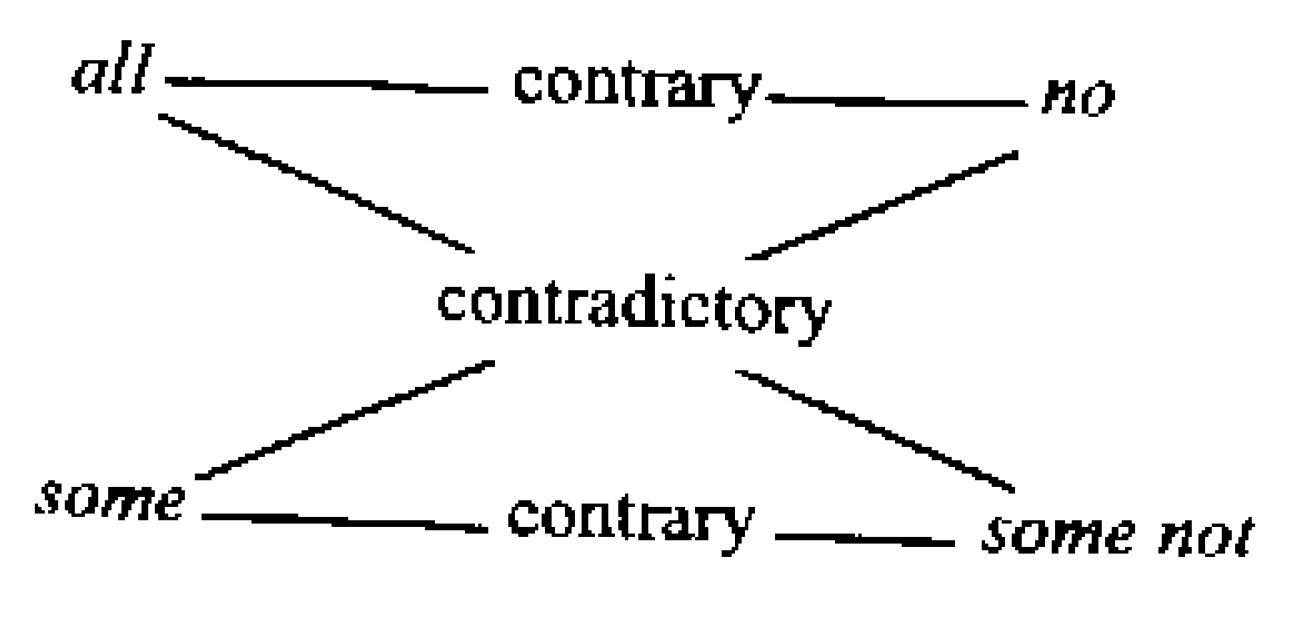 - Subalternation is not explicitly visualized. At the bottom edge of the diagram, "contrary" should be "subcontrary".