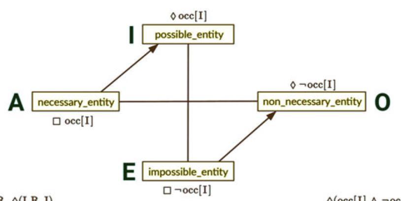 - Selected traditional (top) and generalized (bottom) modal squares of opposition from VIPRS. Here, occ[$I$] stands for "$I$ occurs", and $K_I C I$ stands for "$K_I$ conceptualizes $I$", arrows denote subsumption and solid lines denote complementarity (top) and logical negation with respect to the modal formula (bottom)
