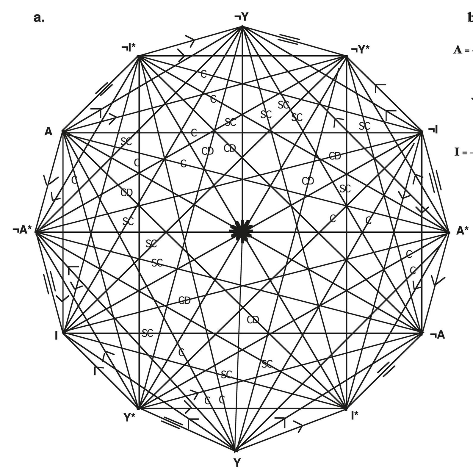 - System S$^{\text{12R}}$ (a) as a (complete) dodecagon, (b) reduced to the Blanché hexagon.