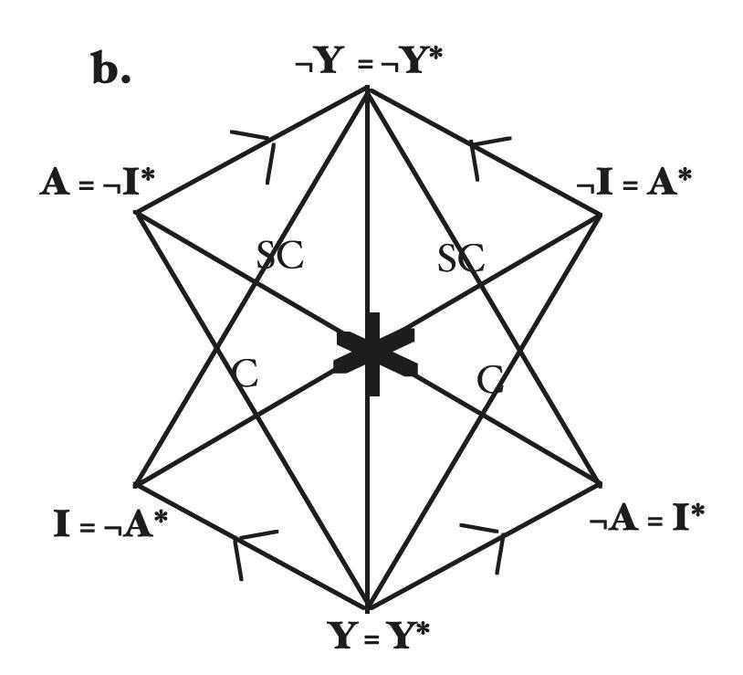 - System S$^\text{12NR+}$ (a) as a (non-complete) dodecagon, (b) reduced to a hexagon.