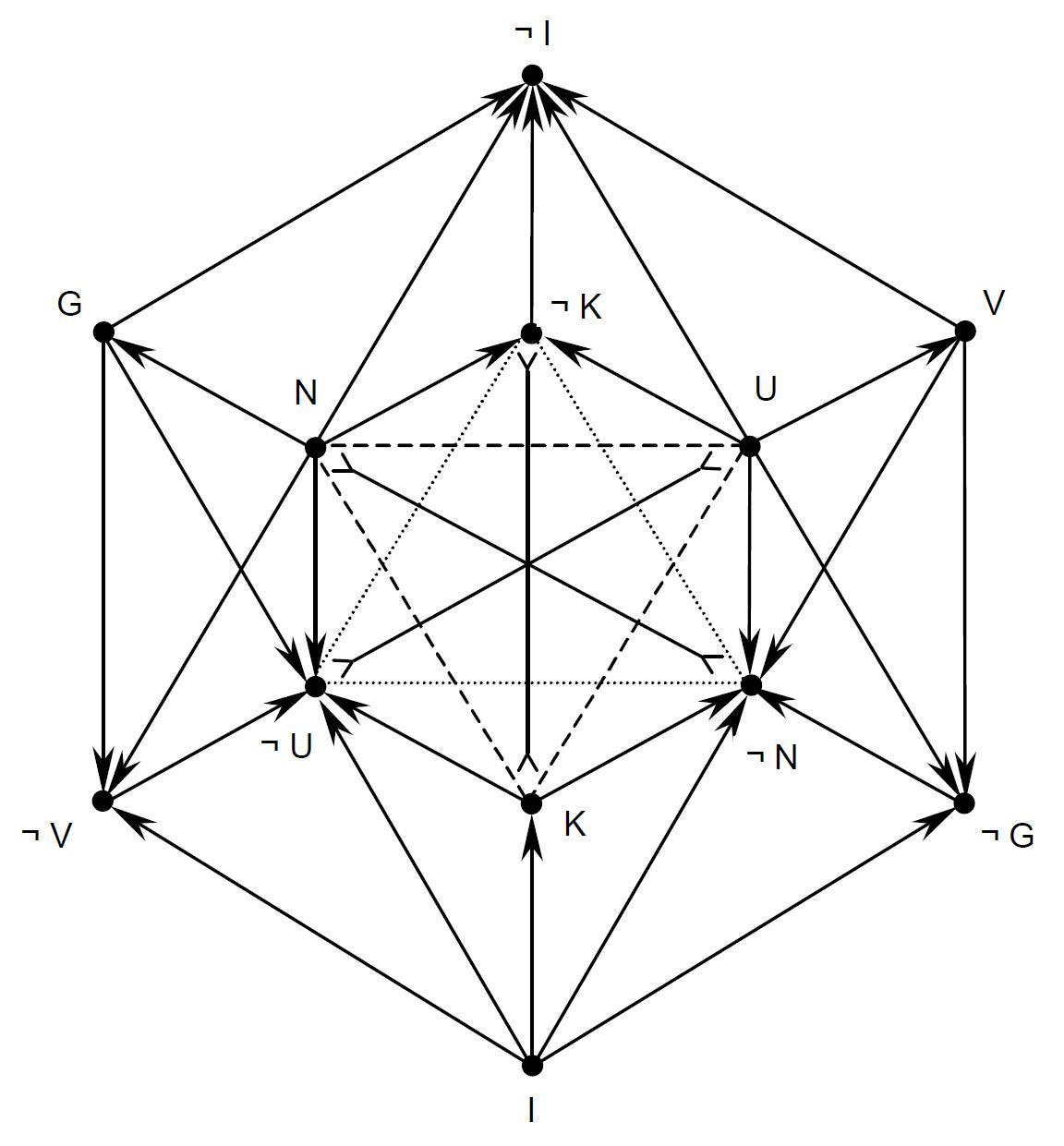 The outermost hexagon consists of the deontic modalities; G = $O p$, V = $O\neg p$, I = $P p\wedge P\neg p$.