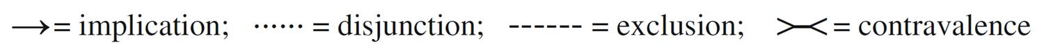 - The edges are labeled with propositional connectives corresponding to the Aristotelian relations (cf. Theorem 1 of Smessaert & Demey, 2014, Logical Geometries and Information in the Square of Oppositions, Journal of Logic, Language and Information 23 : 527 - 565).