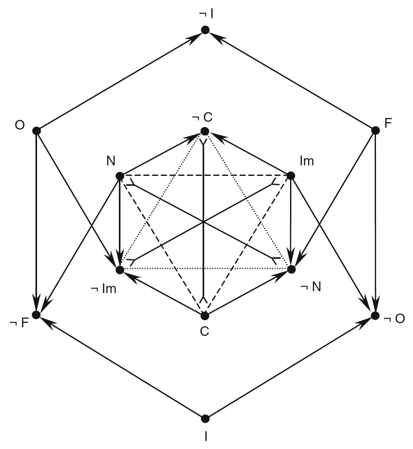 The outermost hexagon consists of the deontic modalities; O = $O p$, F = $O\neg p$, I = $P p\wedge P\neg p$.