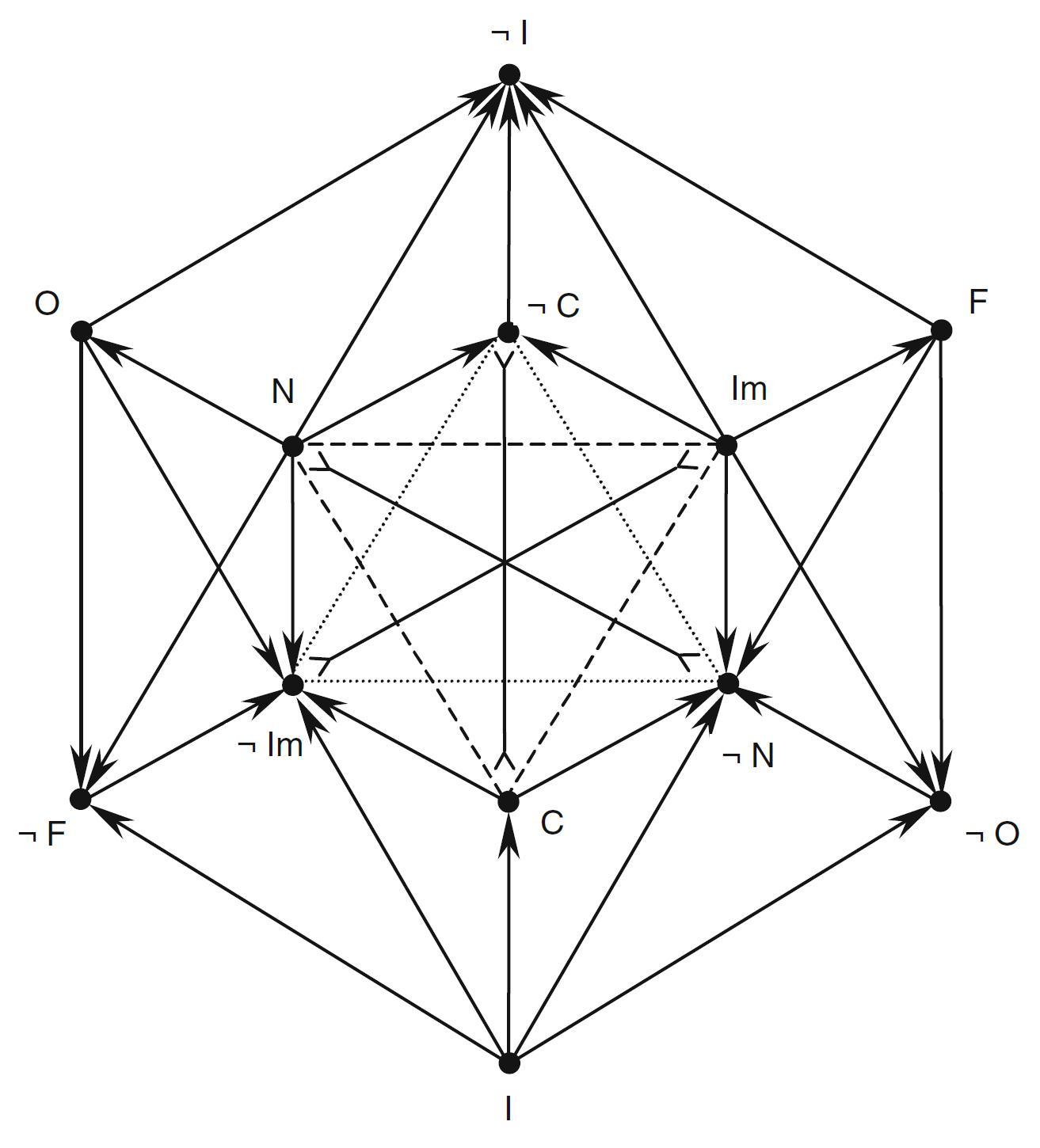 The outermost hexagon consists of the deontic modalities; O = $O p$, F = $O\neg p$, I = $P p\wedge P\neg p$.