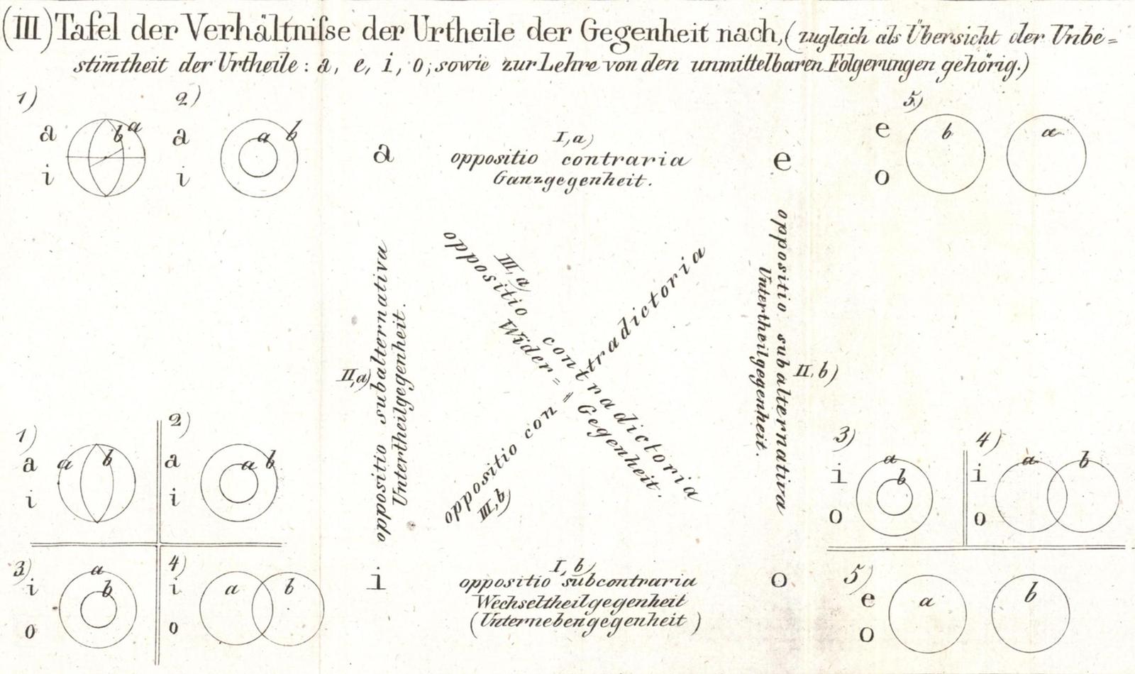 - Tafel der Verhältnisse der Urtheile der Gegenheit nach, (zugleich als Übersicht der Unbestimtheit der Urtheile: a, e, i, o; sowie zur Lehre von den unmittelbaren Folgerungen gehörig.)