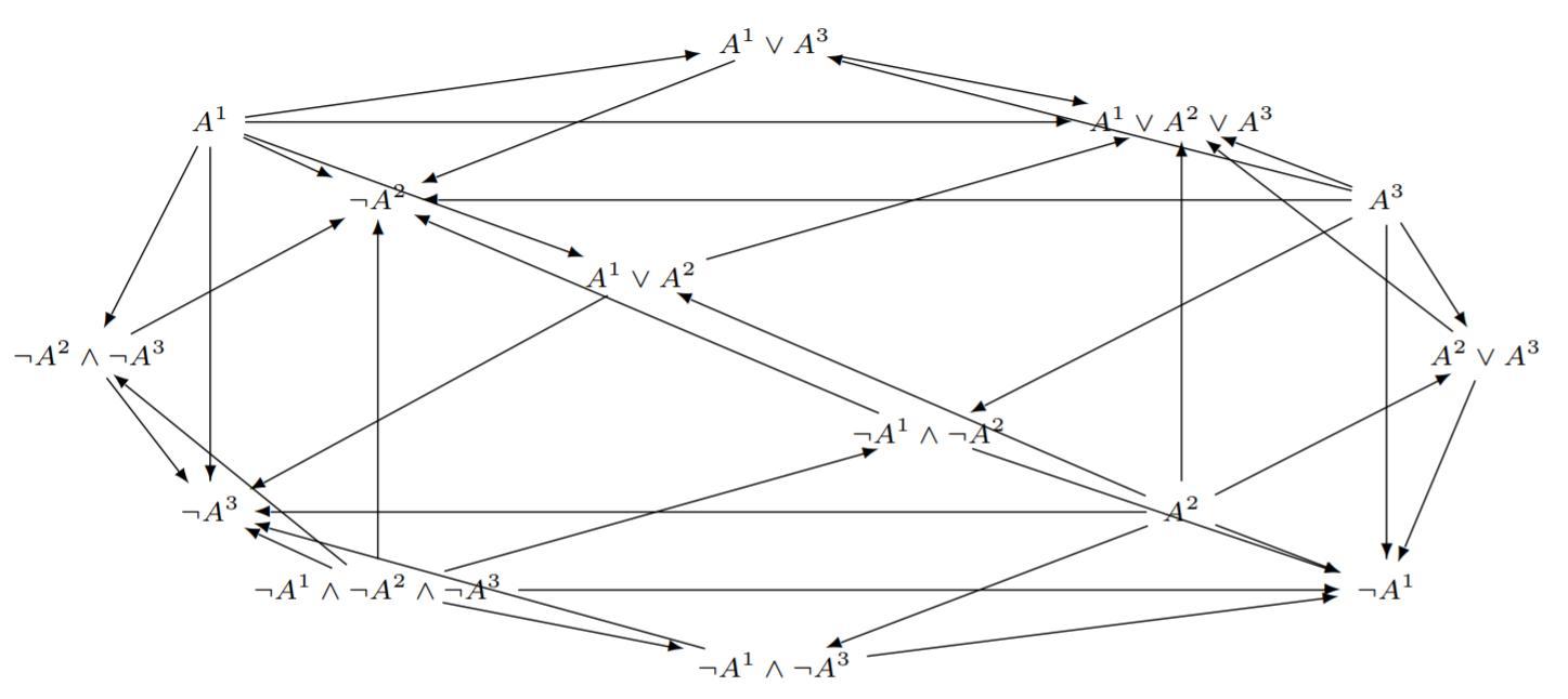 - The four level-1 formulas (i.e., members of the induced partition) are: $A^1$, $A^2$, $A^3$, $\neg A^1 \wedge \neg A^2 \wedge \neg A^3$.