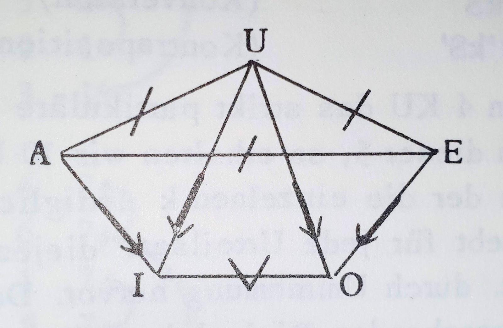 On the edges of the diagram, / stands for contrariety, $\vee$ for subcontrariety, and $\rightarrow$ for subalternation.