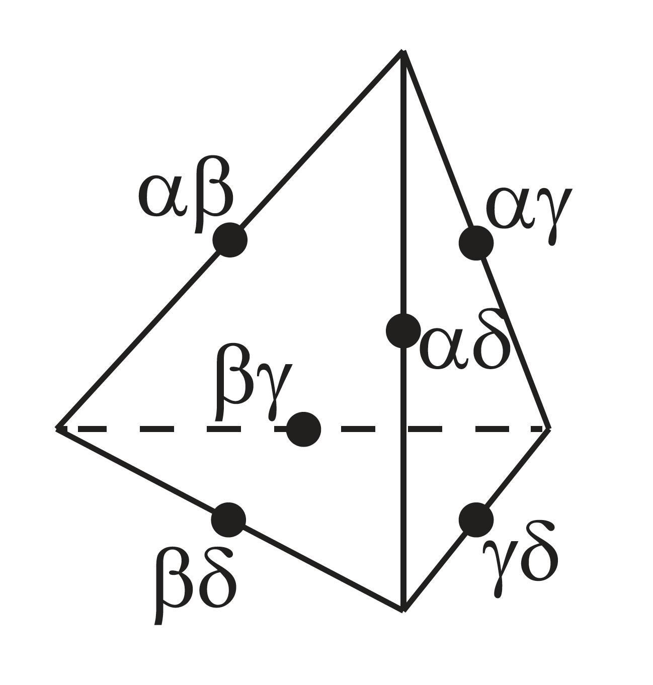 Note: the octahedron shape is easiest to see if the encompassing tetrahedron is tilted so that it stands on one of its edges.