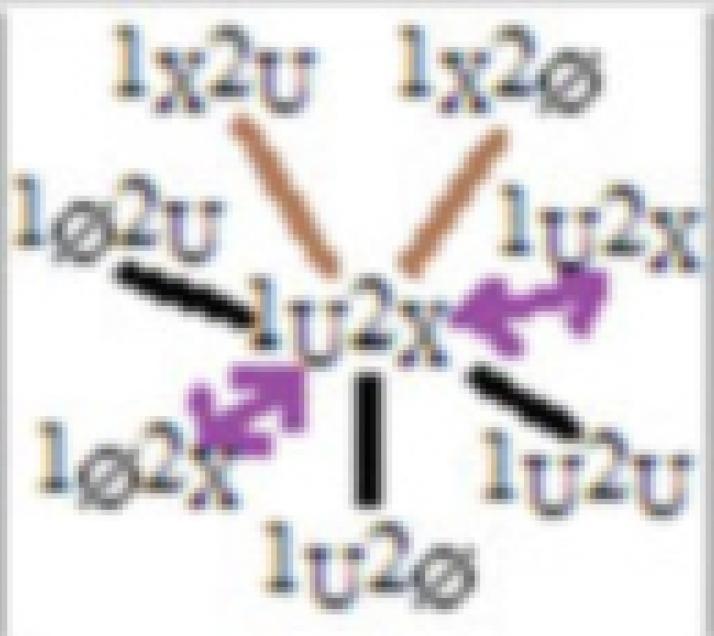 - Synoptical view of the kinds of tri-simplicial opposition relation each vertex has with any possible vertex