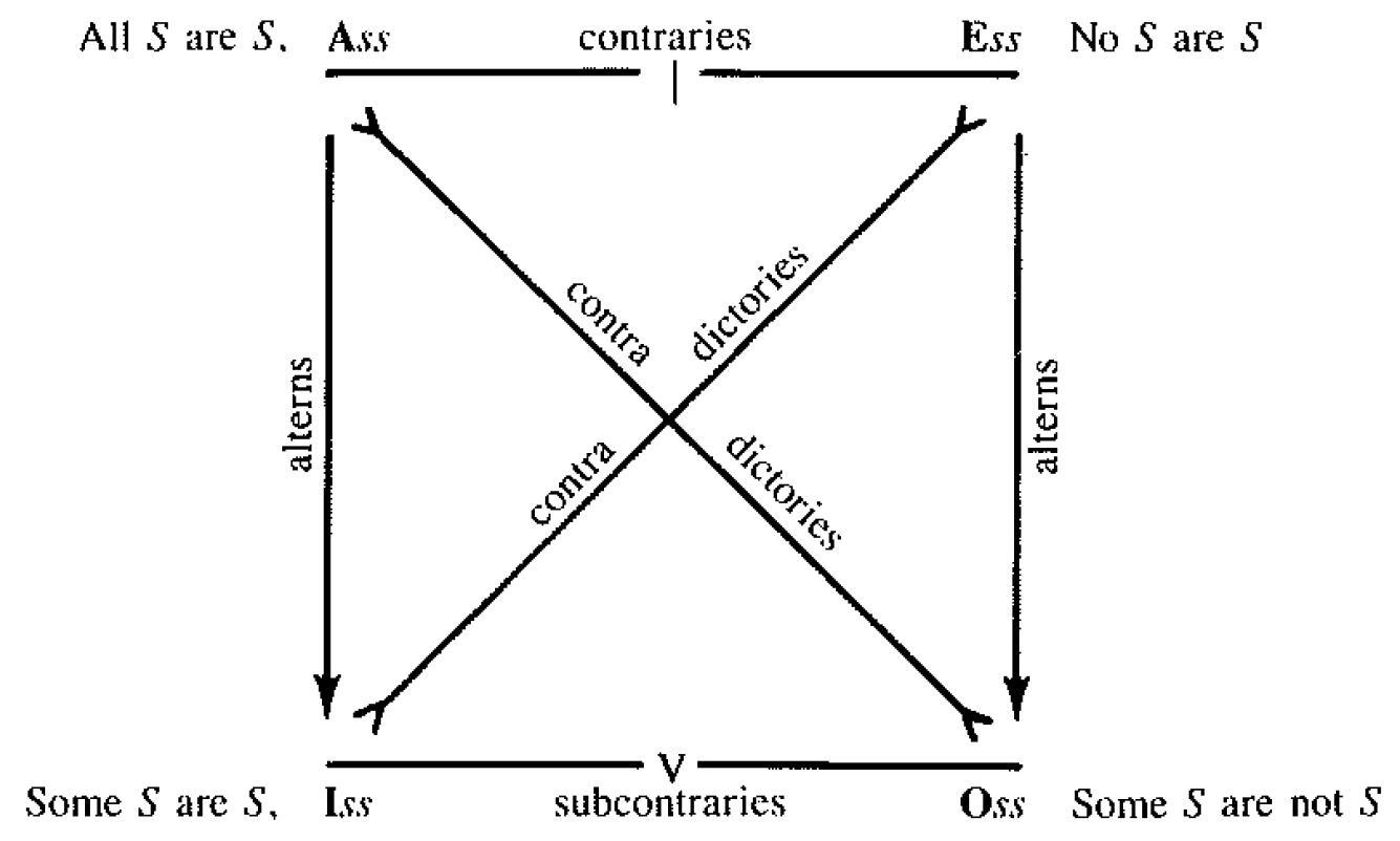 - Ass and Iss are tautological (under the assumption of existential import), while Ess and Oss are contradictory (under that same assumption). Hence this diagram contains only non-contingent formulas, and is thus a sigma-0 diagram.