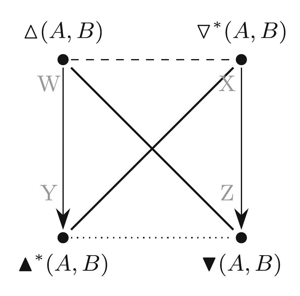 - $\triangle$-rooted (left) and $\triangledown$-rooted (right) Aristotelian KD-squares