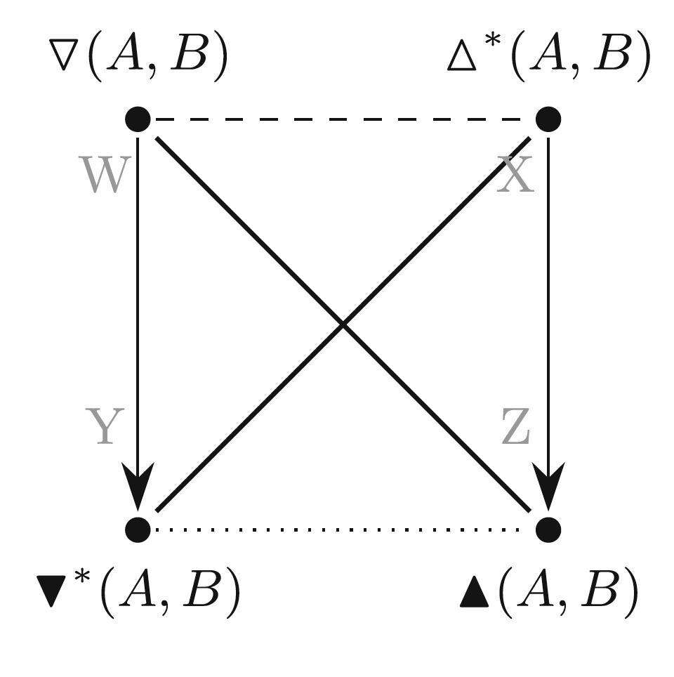 - $\triangle$-rooted (left) and $\triangledown$-rooted (right) Aristotelian KD-squares