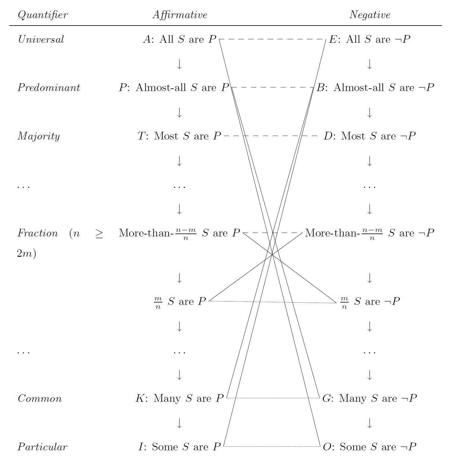 - Generalized squares of opposition (Adapted from Peterson, 1985: 351ff). The solid lines indicate contradictions, dashed contraries, dotted subcontraries, and arrows subalternations (i.e. immediate entailments), respectively. $\neg$ is the negation.