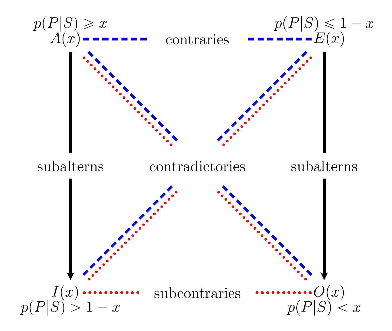 - Probabilistic square of opposition $\mathbf{S}(x)$ involving generalized quantifiers defined on the four sentence types ($A(x), E(x), I(x), O(x)$) with the threshold $x \in \, ]\frac{1}{2}, 1]$ (see also Table 1). In the extreme case where $x =1$, we obtain a new interpretation of the traditional square of opposition (see also Fig. 1), where the corners are labelled by "Every S is P" (A), "No S is P" (E), "Some S is P" (I), and "Some S is not P" (O).