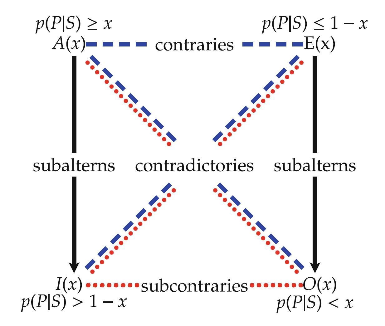- Probabilistic SOP defined on the four sentence types ($\textit{A(x), E(x), I (x), O(x)}$) with the threshold $x \in \ ]\frac{1}{2} , 1]$ (see also Table 1). It provides a new interpretation of the traditional SOP (see, e.g., [19]), where the corners are labeled by "Every S is P" (A), "No S is P" (E), "Some S is P" (I), and "Some S is not P" (O)