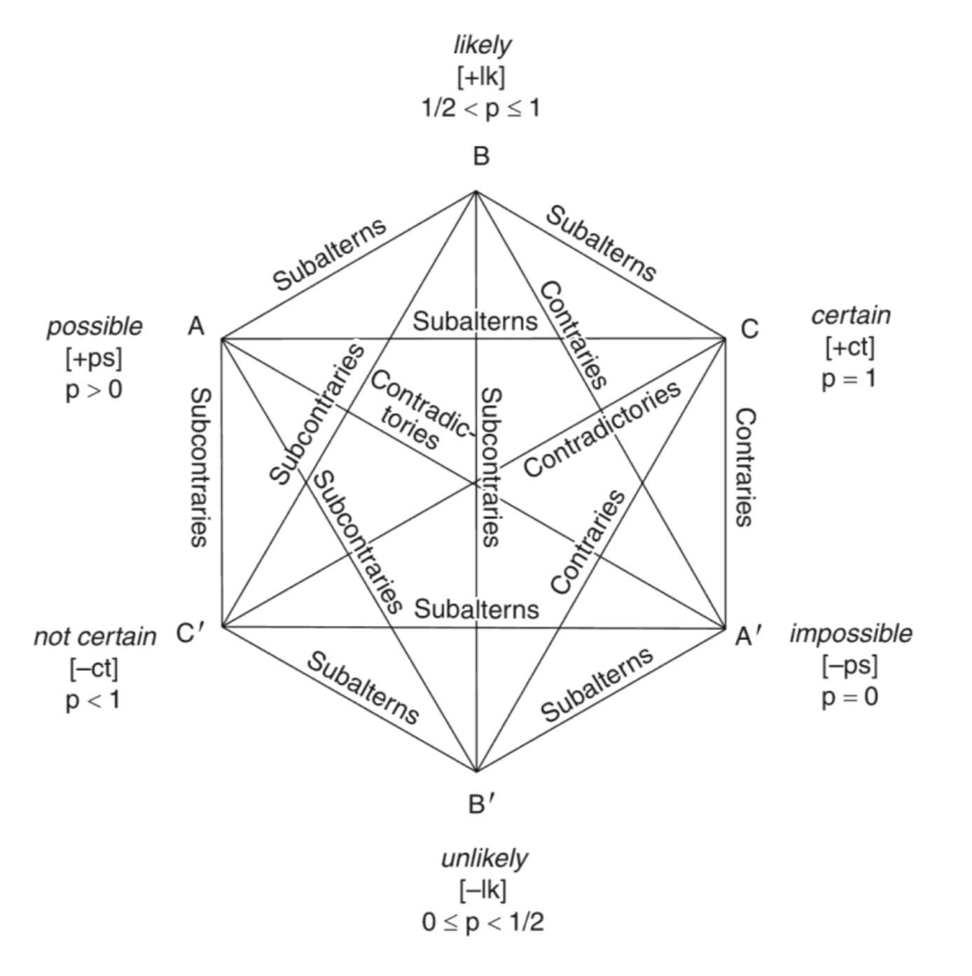 - The negation closure of this diagram involves adding the negations of B and B'. This negation closure is a Lenzen sigma-4. (A more canonical visualization of both this diagram and its negation closure would involve rotating the diagram 90° counterclockwise, so that the subalternations are pointing downwards.)