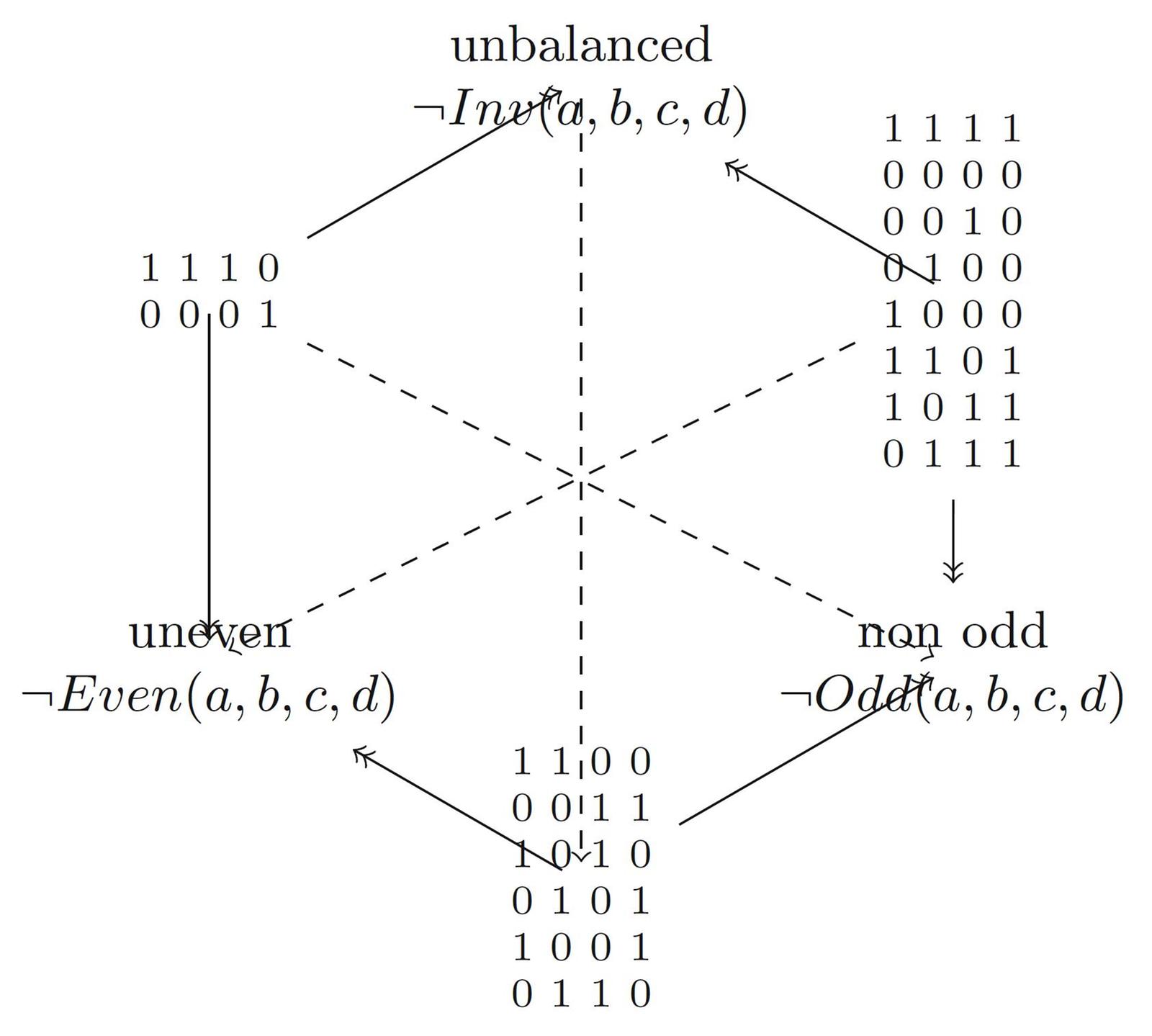 - Hexagon induced by $\textit{Odd}(\{a, b, c\}, d)$, $\textit{Inv}(a, b, c, d)$ and $\textit{Even}(a, b, c, d)$