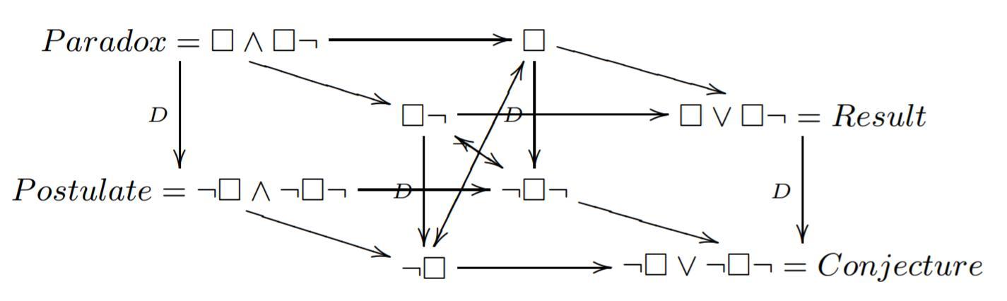 - This diagram assumes the modal logic KD in the background (otherwise, the subalternations marked with 'D' would not hold). But working in KD also means that $\Box \wedge \Box\neg$ is a contradiction and that $\neg\Box \vee \neg\Box\neg$ is a tautology. In other words, this diagram explicitly contains two non-contingent formulas (apart from those two, it is a JSB sigma-3).