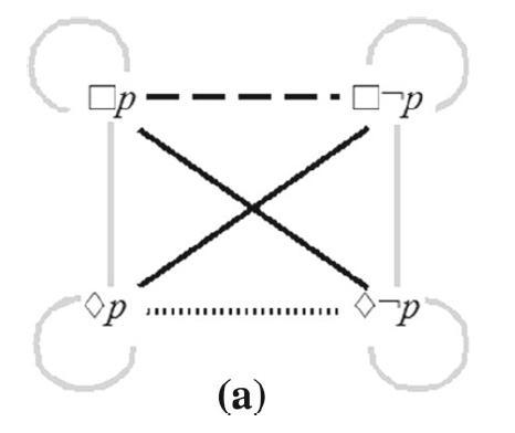 - The a opposition, b Aristotelian and c implication square for $\ \{\Box p, \Box\neg p, \Diamond p, \Diamond\neg p\}$