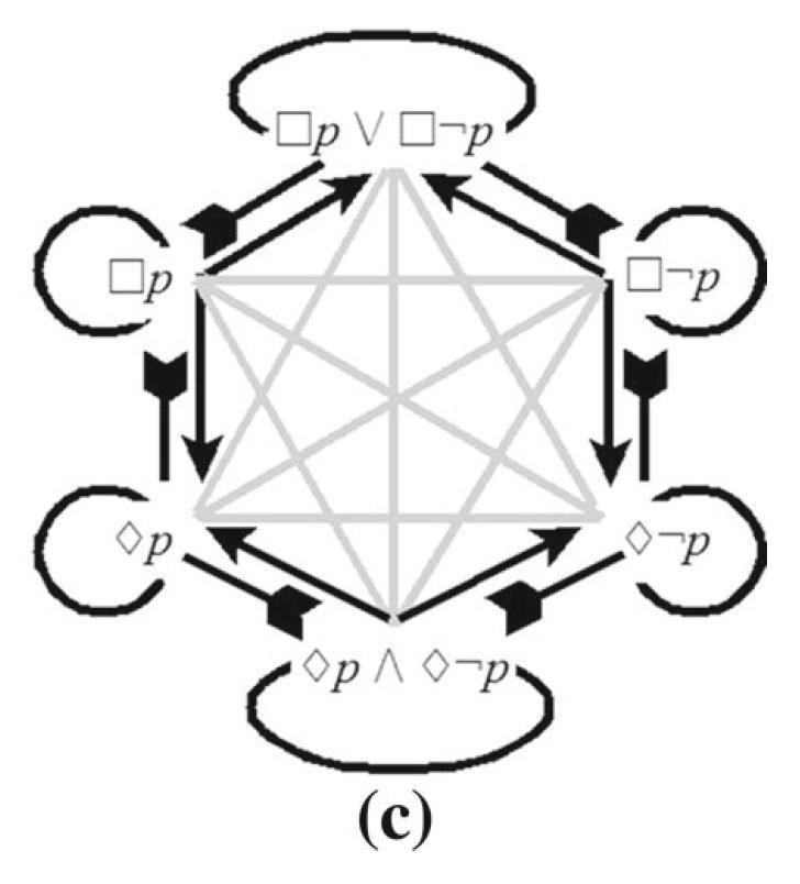 - The a opposition, b Aristotelian and c implication Sesmat-Blanché hexagon for $\ \{\Box p, \Box\neg p, \Diamond p, \Diamond\neg p, \Box p \vee \Box\neg p, \Diamond p \wedge \Diamond\neg p\}$