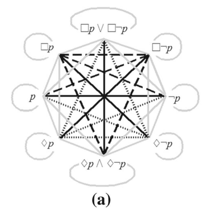 - The a opposition, b Aristotelian and c implication Béziau octagon for $\ \{\Box p, \Box\neg p, \Diamond p, \Diamond\neg p, \Box p \vee \Box\neg p, \Diamond p \wedge \Diamond\neg p, p, \neg p\}\\$ (the RI relations have not been visualized in (c) for the sake of visual clarity)