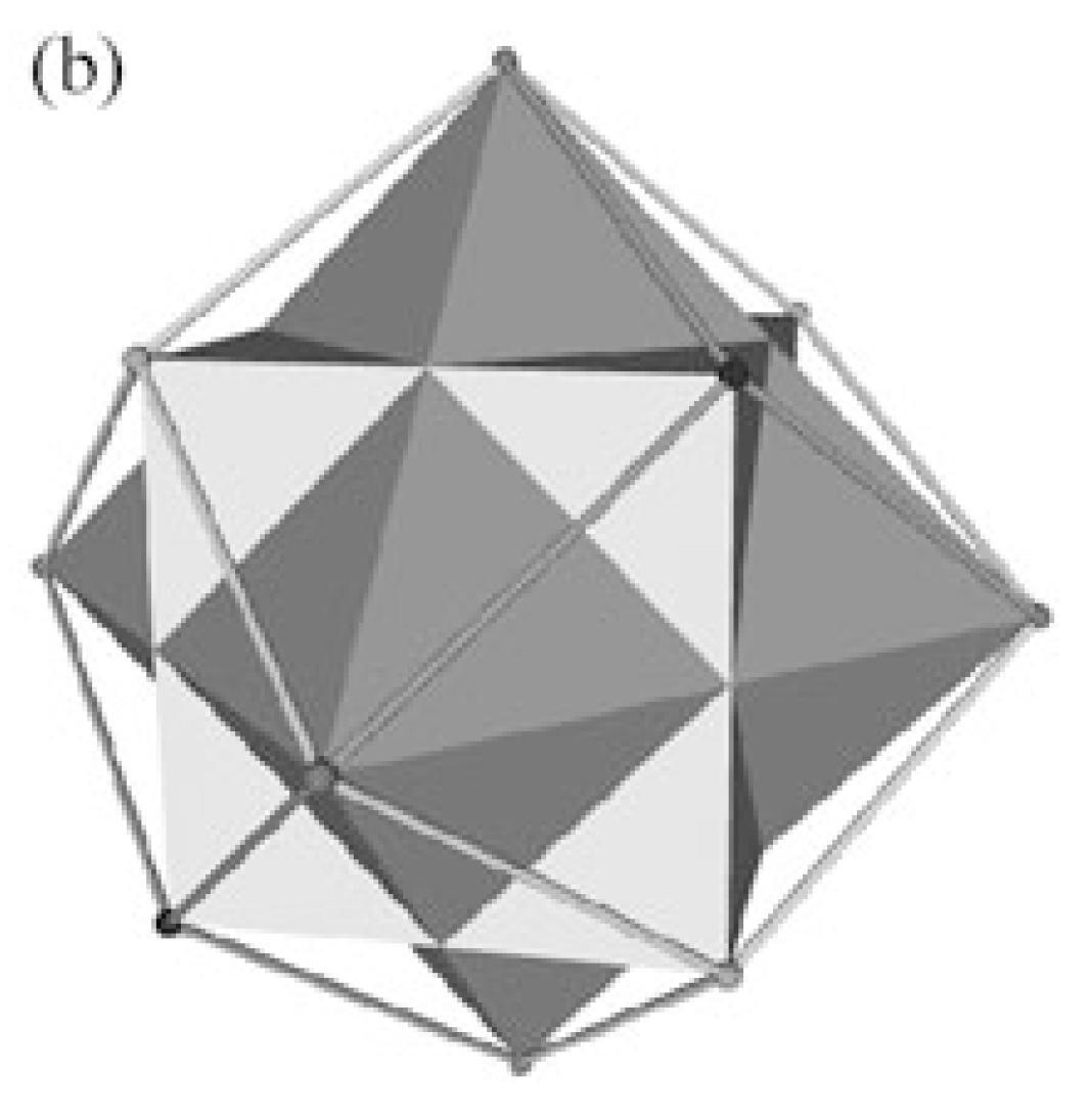 (a) The rhombic dodecahedron, (b) the rhombic dodecahedron as the compound of a cube and an octahedron