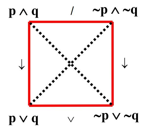 - The edges are labeled with propositional connectives corresponding to the Aristotelian relations (cf. Theorem 1 of Smessaert & Demey, 2014, Logical Geometries and Information in the Square of Oppositions, Journal of Logic, Language and Information 23 : 527 - 565).