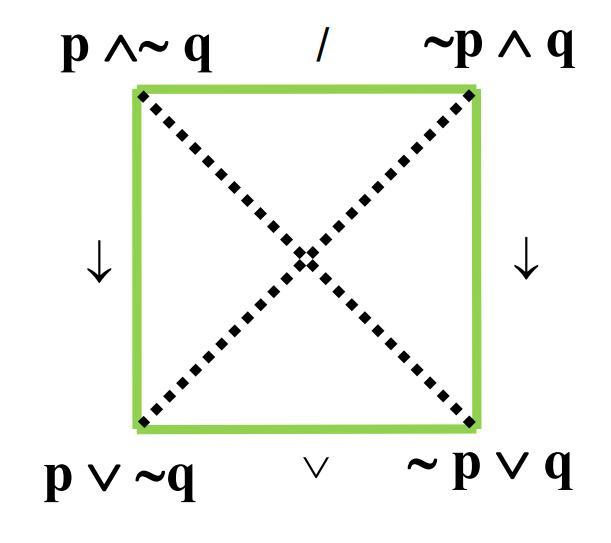 - The edges are labeled with propositional connectives corresponding to the Aristotelian relations (cf. Theorem 1 of Smessaert & Demey, 2014, Logical Geometries and Information in the Square of Oppositions, Journal of Logic, Language and Information 23 : 527 - 565).