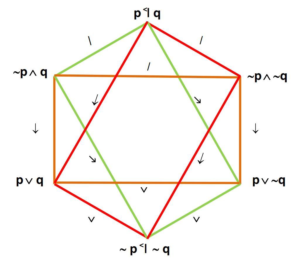 - The edges are labeled with propositional connectives corresponding to the Aristotelian relations (cf. Theorem 1 of Smessaert & Demey, 2014, Logical Geometries and Information in the Square of Oppositions, Journal of Logic, Language and Information 23 : 527 - 565).