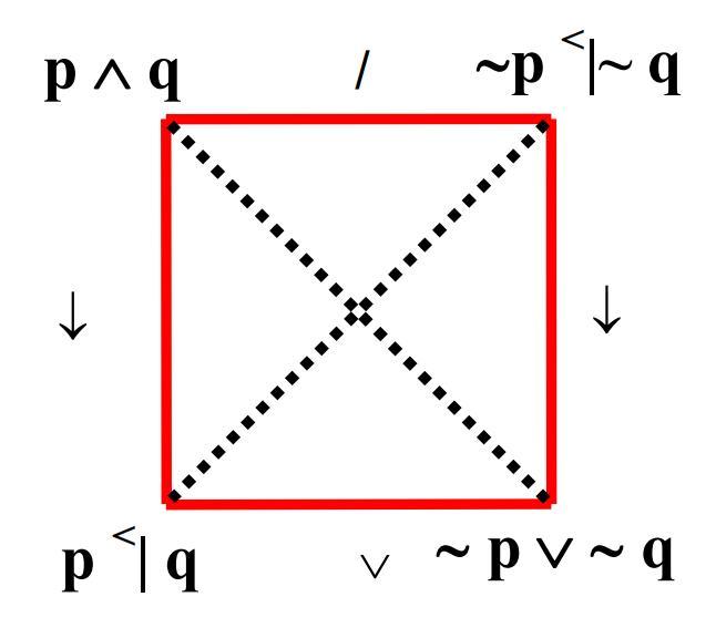- The edges are labeled with propositional connectives corresponding to the Aristotelian relations (cf. Theorem 1 of Smessaert & Demey, 2014, Logical Geometries and Information in the Square of Oppositions, Journal of Logic, Language and Information 23 : 527 - 565).