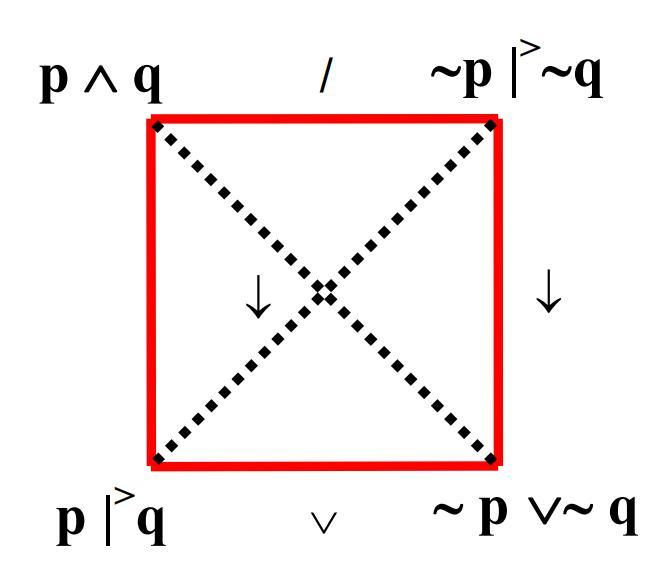 - The edges are labeled with propositional connectives corresponding to the Aristotelian relations (cf. Theorem 1 of Smessaert & Demey, 2014, Logical Geometries and Information in the Square of Oppositions, Journal of Logic, Language and Information 23 : 527 - 565).