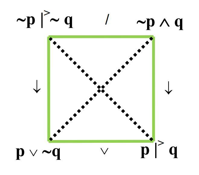 - The edges are labeled with propositional connectives corresponding to the Aristotelian relations (cf. Theorem 1 of Smessaert & Demey, 2014, Logical Geometries and Information in the Square of Oppositions, Journal of Logic, Language and Information 23 : 527 - 565).