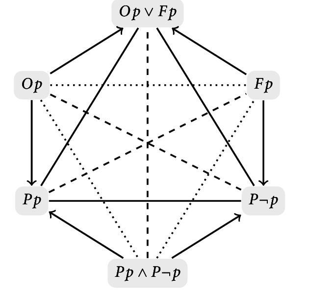 - The hexagon of logical relations holding in standard KD deontic logic. The dotted line represents the contrariety relation, the dashed line represents contradiction, the full line represents subcontrariety, and the arrows represent subalternation (implication). Deontic concepts are expressed in natural language in the left hexagon while the right hexagon presents the corresponding formulas.